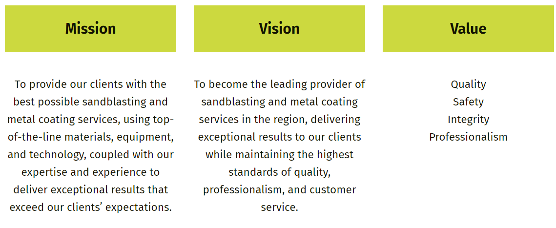 Become the premier sandblasting and metal coating service provider in the region, delivering exceptional results while maintaining a high level of professionalism, quality, and customer service.
